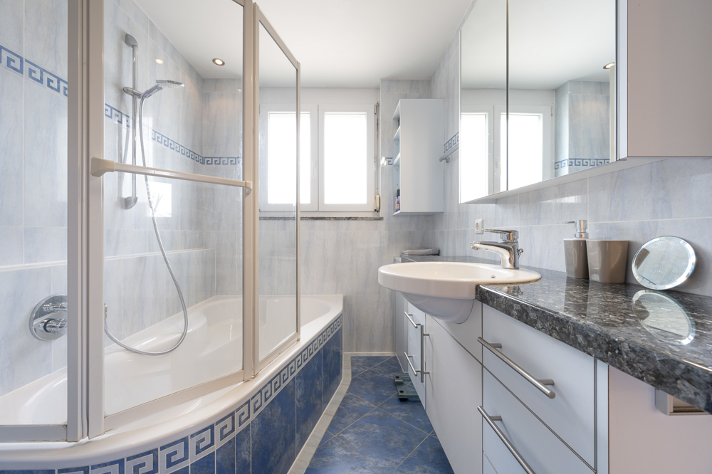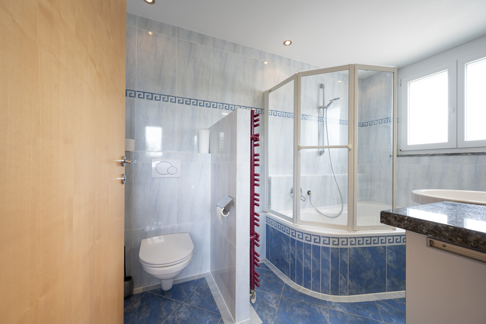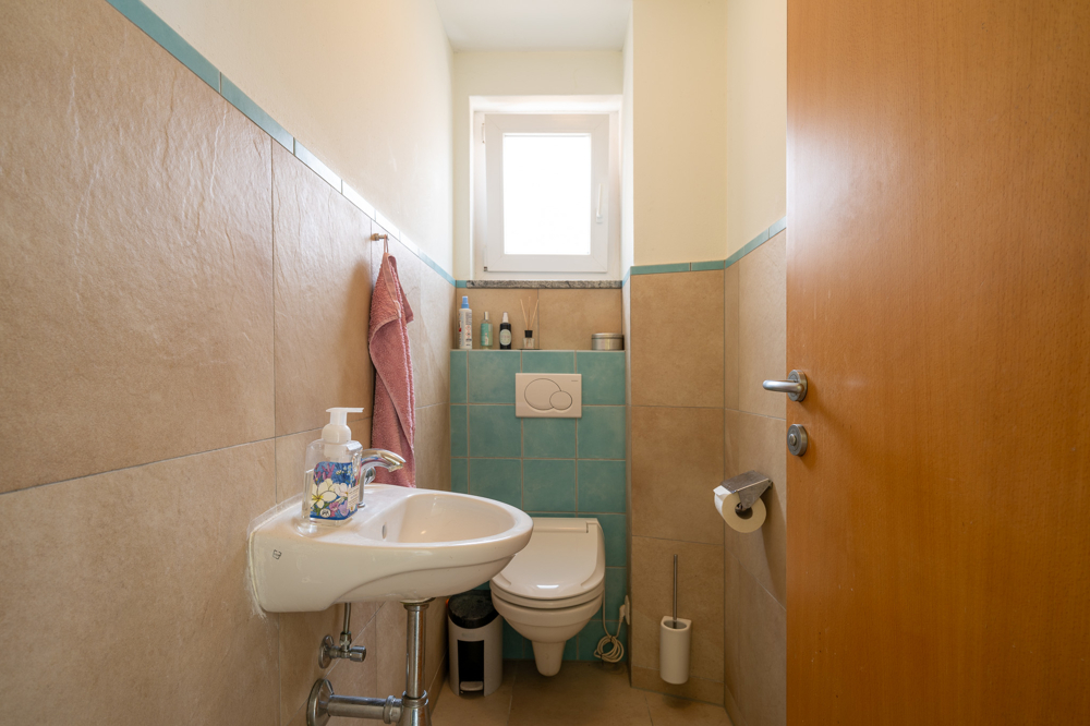 Badezimmer im Obergeschoss mit WC, Badewanne, Waschbecken, Armaturen und Fenster etc.