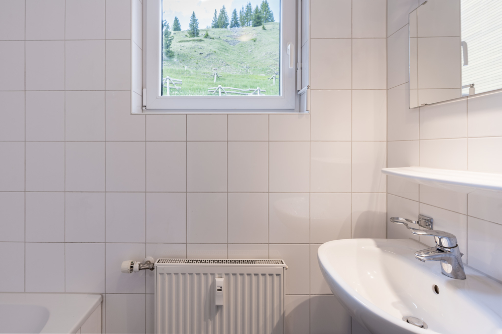 - wandhoch weiß gefliestes Badezimmer mit Badewanne (inkl. Duschwand), Waschbecken, Spiegelschrank, Handtuchwärmer und Fenster