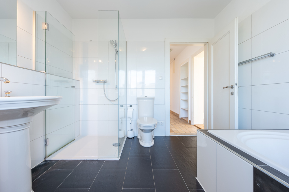 Der Fußboden wurde in Gräten-Parkett ausgeführt, die Nassräume und der Vorraum / Flur sind verfliest.