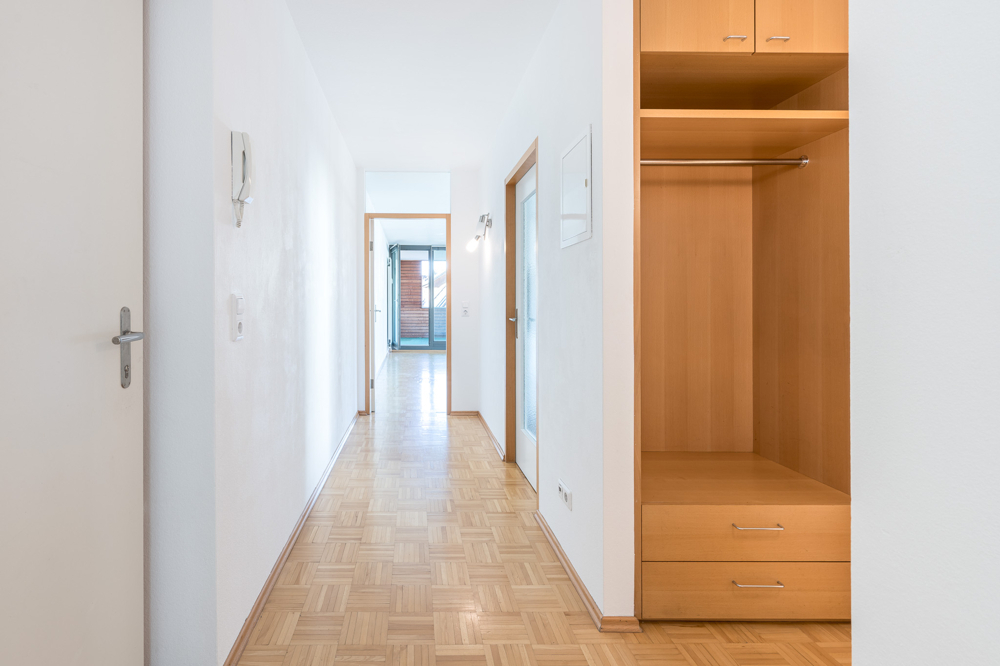 Vom Vorraum sind sämtliche Räume, Garderobe/Diele, WC, Badezimmer, die 2 Schlafzimmer auf der Ostseite als auch Küche, Wohnzimmer getrennt begehbar. Vom Wohnzimmer gelangt man auf die westseitige überdachte ca. 13,30 m² große Terrasse.