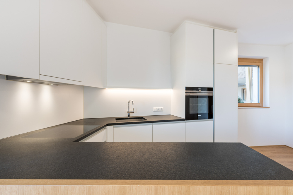 Küche: Tischlerküche mit schwarzer Steinplatte, gebürstet und allen Geräten